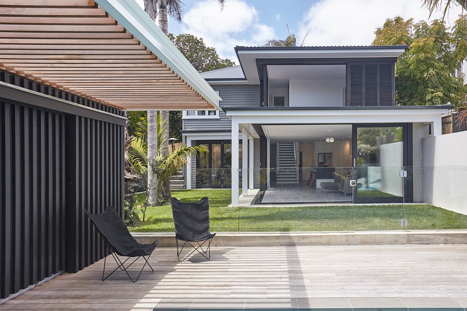 Traditional Bungalow renovation project. The build included excavation of a sloping section to build a new lower level extension with open-plan kitchen/dining/living areas. The client brief was to inject a touch of Bali into the extension and to rework the original front of the home to include a central entry and hallway. Stage two saw Trueline return for hard landscaping including a new pool, poolhouse and decking. Timber slats and batons created sleek lines on the poolhouse to enhance the Bali vibe.